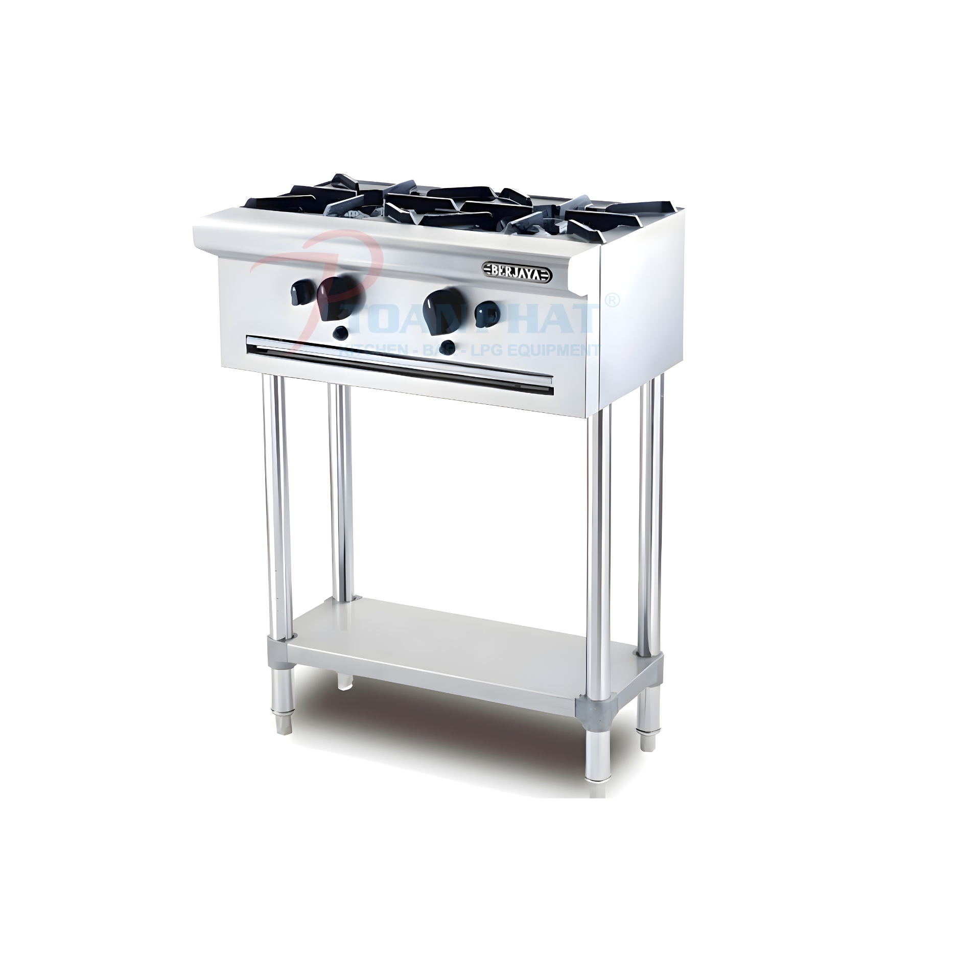 Bếp Âu 2 họng có chân đứng là thiết bị chuyên dụng dành cho các bếp ăn phong cách Âu. Với kích thước nhỏ gọn chiếc bếp này thích hợp cho các khu bếp nhà hàng, quán ăn hay khách sạn có quy mô nhỏ. Bếp Âu 2 họng thường được dùng để chế biến các món ăn như: soup, ốp la,…những món ăn cần nấu với cường độ lửa vừa phải, nấu trong thời gian lâu.