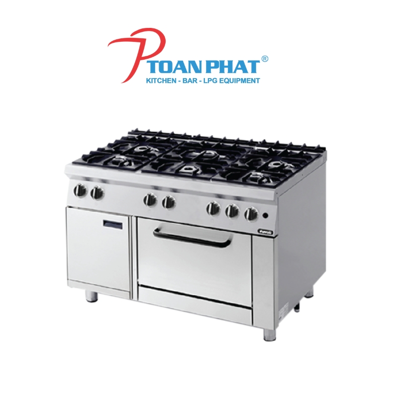 Bếp kết hợp 6 họng gas công suất cao với lò nướng điện đa năng, giúp tiết kiệm không gian bếp và tối ưu hóa hiệu quả nấu nướng. Bạn có thể nấu nhiều món trên bếp gas trong khi lò nướng thực hiện các món nướng, hầm, hoặc quay đồng thời.