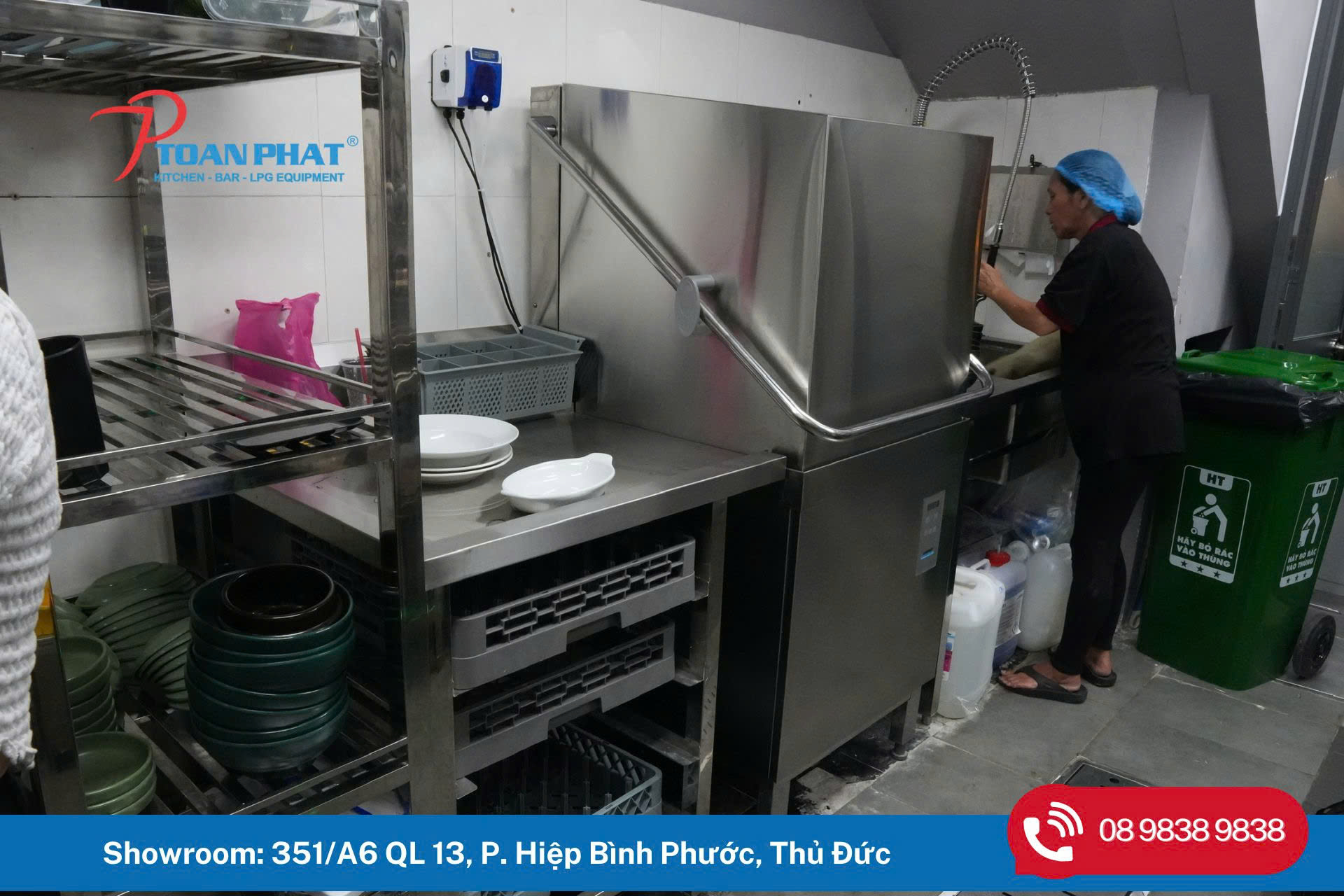 Khu rửa là nơi làm sạch chén dĩa, xoong nồi và các dụng cụ bếp sau khi sử dụng. Tại đây, Toàn Phát đã lắp đặt chậu rửa inox kích thước lớn, máy rửa chén công nghiệp Winterhalter P50, giá kệ úp chén. Khu vực này được bố trí tách biệt với khu nấu và khu ra món để đảm bảo vệ sinh và giữ không gian bếp luôn sạch sẽ.